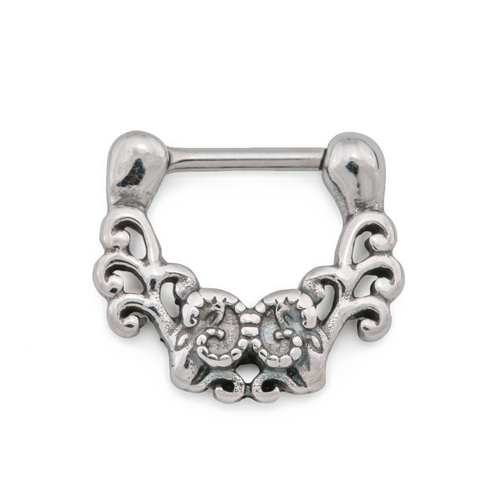 16g Stainless Steel Septum Ring with Clicker Mechanism — Antique Filigree Design