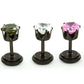 Enjoy a simple look and subtle sparkle with the 18g Prong Set 6mm Jewel Threaded Stud Earring. This jewelry is made of stainless steel and boasts a 6mm prong-set jewel attached to a 18g post. The post measures approximately 1/4” in length and has external 1.2mm threading, which threads on to a steel disc backing that is 3mm thick and 6mm in diameter. The jewel comes in one of five color options. This jewelry is plated with PVD black for a polished, jet-black, durable surface. The 18g Prong Set 8mm Jewel Threaded Stud Earring is priced per one; a black O-ring is included with your purchase.