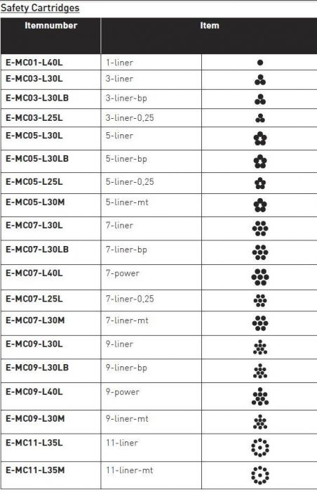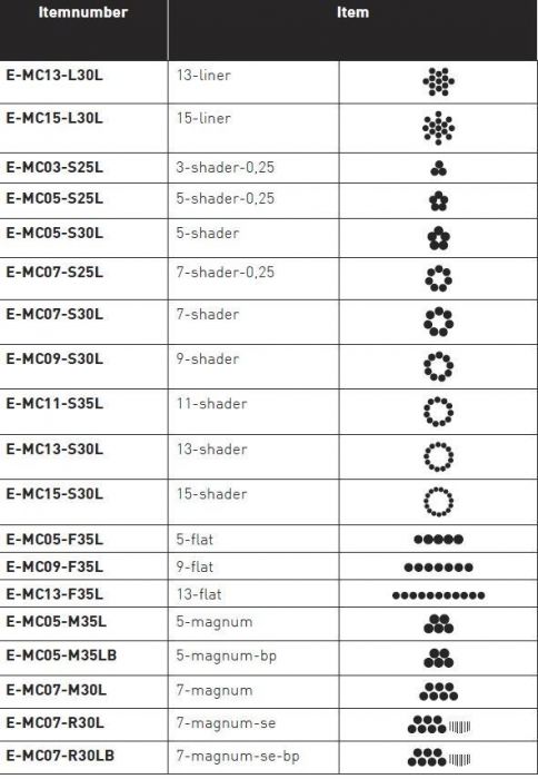 Needle Grouping #14 (0.40mm) 1 Round Liner Long Taper, #8 (0.25mm) 3 Round Liner Long Taper, #8 (0.25mm) 5 Round Liner Long Taper, #8 (0.25mm) 7 Round Liner Long Taper, #8 (0.25mm) 3 Shader Long Taper, #8 (0.25mm) 5 Round Shader Long Taper, #8 (0.25mm) 7 Round Shader Long Taper, #10 (0.30mm) 5 Round Liner Medium Taper, #10 (0.30mm) 7 Round Liner Medium Taper, #10 (0.30mm) 9 Round Liner Medium Taper, #10 (0.30mm) 3 Round Liner Long Taper, #10 (0.30mm) 5 Round Liner Long Taper, #10 (0.30mm) 7 Round Liner Long Taper, #10 (0.30mm) 9 Round Liner Long Taper, #10 (0.30mm) 13 Round Liner Long Taper, #10 (0.30mm) 13 Round Liner Long Taper Textured, #10 (0.30mm) 15 Round Liner Long Taper, #10 (0.30mm) 3 Bugpin Round Liner Long Taper, #10 (0.30mm) 5 Bugpin Round Liner Long Taper, #10 (0.30mm) 7 Bugpin Round Liner Long Taper